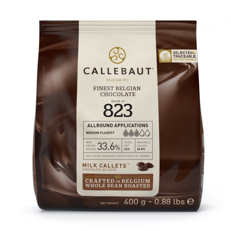 Die Callebaut Callets Milch sind zum Schmelzen gedacht und haben eine ausgewogenen Milch-, Kakao- und Karamellgeschmack. Die Callets enthalten 33,6 % Kakao und sind aus feinster belgischer Schokolade. Wunderbar geeignet zur Herstellung von Bonbons und Schokolade. Aber auch um z.B. Ihre Cupcakes oder Kuchen zu überziehen.
