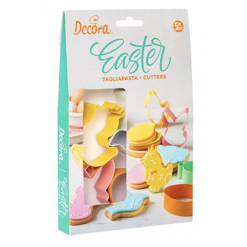 Set mit 5 Ausstechformen aus farbigem Metall in klassischen Osterformen; ideal zum Backen von Keksen und süßen oder herzhaften Formen, aus Schokolade und Modelliermasse,