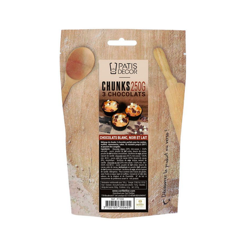Eine Mischung aus dunklen, weißen und Milchschokoladenstückchen. Sie sind ideal für Kekse, aber auch für Muffins, Brioches, Gebäck, Mürbeteiggebäck, Cakes, Trockenöfen, Süßwareninnenräume (Ganache), Eis, Dekorationen, Verzehr in unverändertem Zustand usw.