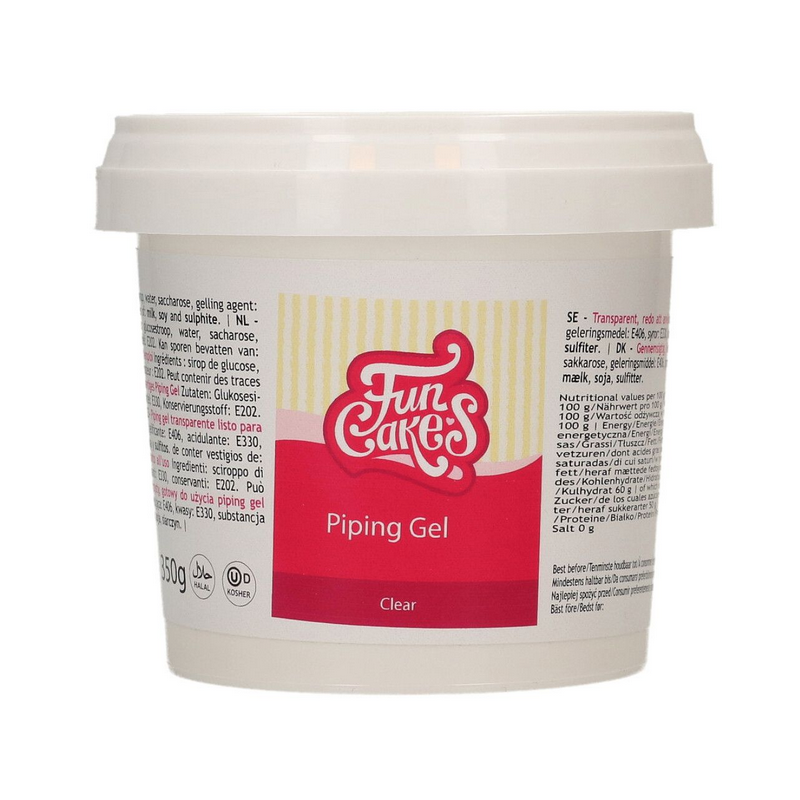 Der FunCakes Piping Gel ist ein transparenter Gel, der wunderschöne Effekte auf Torten erzeugen kann, z. B. Wassertropfen oder Nebeleffekte. Sie können damit auch die Oberseite von Cupcakes dünn bestreichen, bevor Sie sie mit Marzipan oder Fondant überziehen. Darüber hinaus ist dieses Gel ideal, um eine Esspapier- oder Zuckerbild-Dekoration auf einer Torte zu befestigen. Dank der Transparenz bleibt das Gel unter dem Bild unsichtbar.