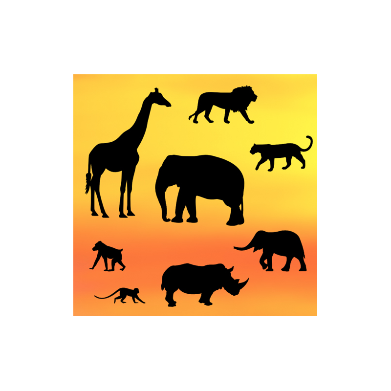 8 geschiedene Tiere: Giraffe, Elefant, Löwe (2x), Affe (2x) und Nashorn