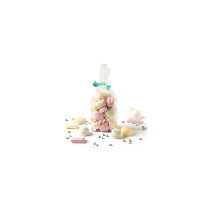 Lebensmittelbeutel aus Kunststoff mit praktischem festem Boden. Perfekt für Süßigkeiten, Bonbons, Kekse usw. Der bequeme feste Kartonboden sorgt dafür, dass die Tüte stabil steht.