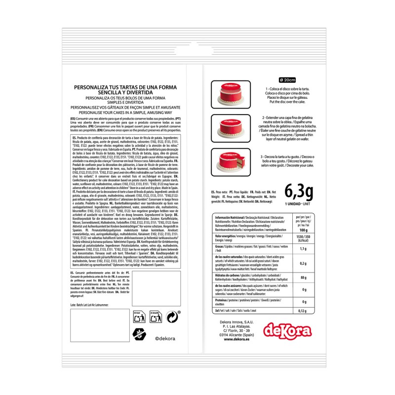 Diese 20 cm langen essbaren Papierscheiben eignen sich perfekt zum Dekorieren von Kuchen, Torten und Desserts. Sie sind einfach zu verwenden und werden direkt auf die Oberfläche Ihrer Kreationen gelegt, um einen eleganten visuellen Effekt zu erzielen. Da sie aus essbarem Papier hergestellt werden, sind sie völlig unbedenklich zu verzehren und in verschiedenen Designs erhältlich, sodass sie zu jeder Art von Veranstaltung passen. Ideal für Geburtstage, Hochzeiten und andere Feiern, verleihen diese Scheiben Ihren Desserts einen persönlichen und professionellen letzten Schliff.