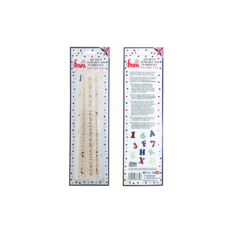 MM tappit cutters in Art Deco style. This ruler like cutter set is perfect for creating letters and numbers. This is the upper case set, featuring A to Z and 0 to 9. The letters are approx. 2 cm high.
