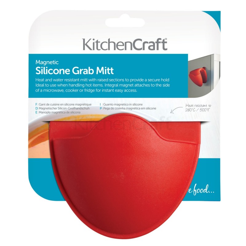 This handy grab mit is made from non-slip, flexible, heat resistant silicone, with added raised grips for a superior hold on any item. Protects both palms and hands from heat and burns and with an integral magnet, the mit can be attached to the sides of ovens, microwaves, or fridge doors so it is always easily to hand when required.