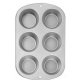 This baking pan will hold 6 muffins. Sizes of the cups: at the top: 8,5cm diameter, at the base: 6,5 cm diameter. 4,5 cm deep. Not dishwasher safe.
