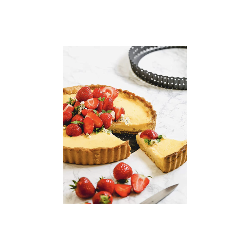 Make delicious quiches, flans and tarts with this non-stick, loose base, fluted round quiche tin. The perforated holes along the base and sides ensure the air circulates freely during the cooking process and you can create fruit flans and savoury quiches with the perfect golden-brown, crisp crust. Let's banish the soggy bottom forever! Various sizes available.