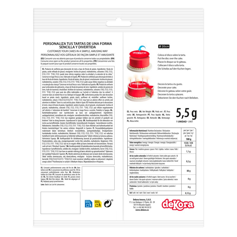 These 20 cm edible paper discs are perfect for decorating your cakes, tarts and desserts. Easy to use, they can be placed directly on the surface of your creations for an elegant visual effect. Made from edible paper, they're completely safe to eat and available in a variety of designs to suit any event. Ideal for birthdays, weddings and other celebrations, these discs add a personalised and professional finishing touch to your desserts.