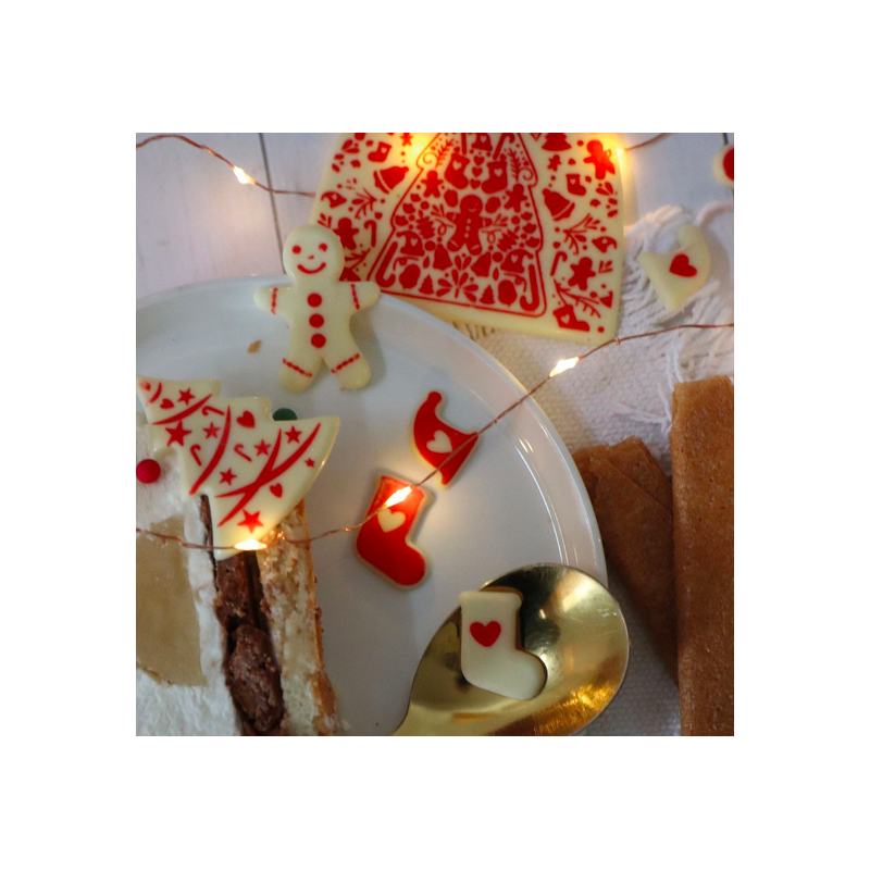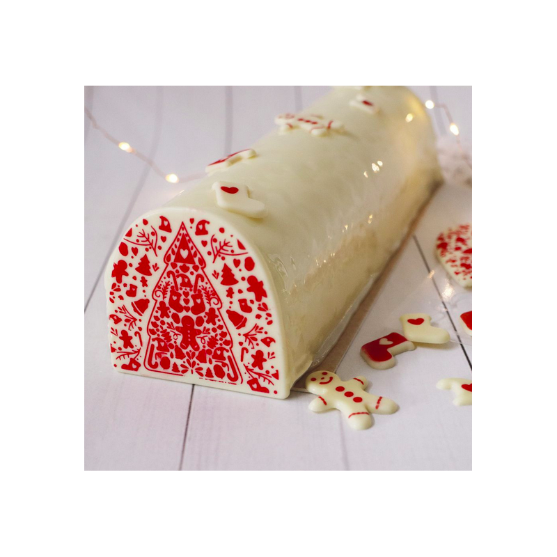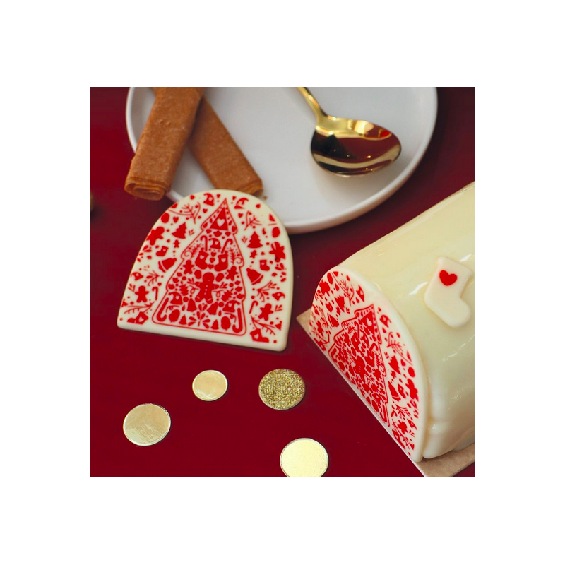 To use this mould to create your own decorations, simply pour the chocolate into the cavities and the red decorations will be printed on once they have set in the fridge.