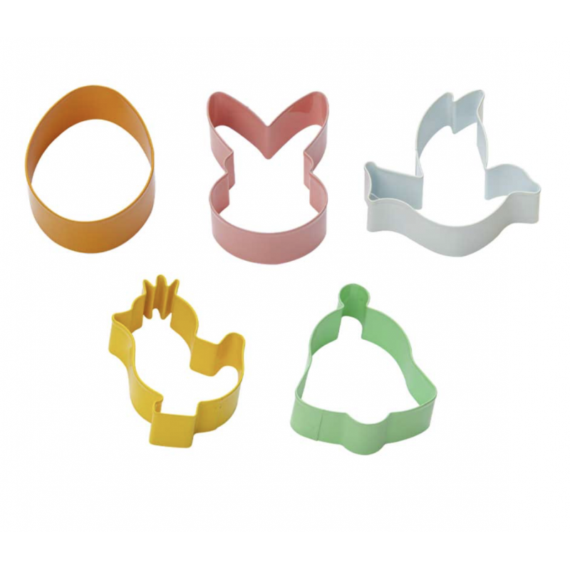 Set of 5 coloured metal cookie cutters in classic Easter shapes; ideal for making biscuits, sweet and savoury shapes, chocolate and modelling clay,