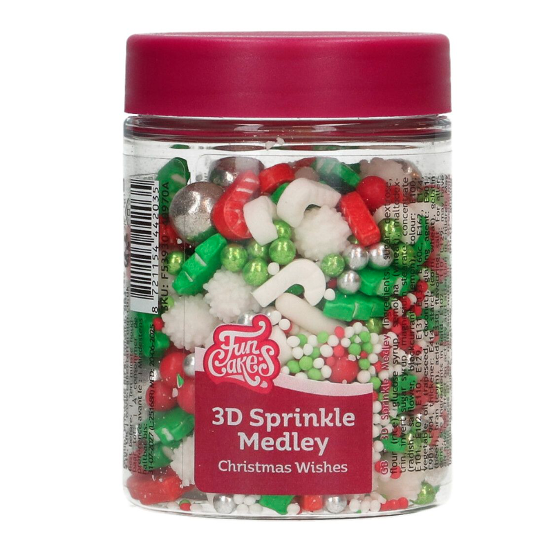 FunCakes 3D Sprinkle Medley – Christmas Wishes is the easy way to give your Christmas baking a warm and joyful holiday twist! Red and white sprinkles, shiny pearls, and festive green Christmas trees add cheerful holiday magic to every creation.