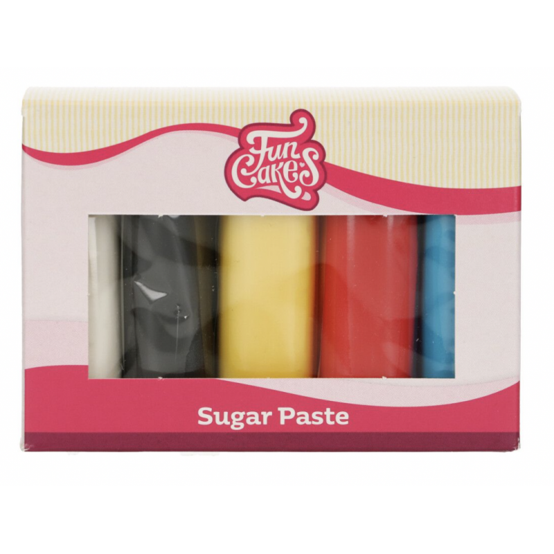 Cover cakes and decorate cupcakes and cookies with this handy set of five essential colours of FunCakes rolled fondant. This set contains out of black, red, yellow, white and blue that are also great for making fun decorations.