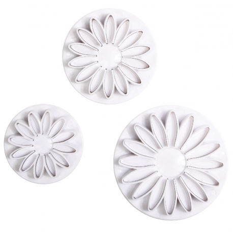 These set of three assorted sized sunflower shaped plunger cutters are perfect for creating professional cake decorations. Featuring a spring mechanism which cuts, embosses and releases the icing to produce perfectly formed sunflowers. Layer each size to create three dimensional sunflowers. Ideal for use with sugarpaste, rolled fondants, royal icing, gumpaste, marzipan and non-edible clays.