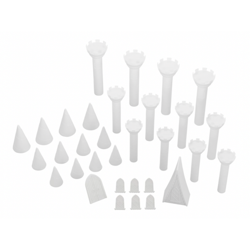 Dimensions of the towers: 6 cm in diameter. Tower heights: 21.5, 17.2 and 15.8 cm (not including the crenellated top).