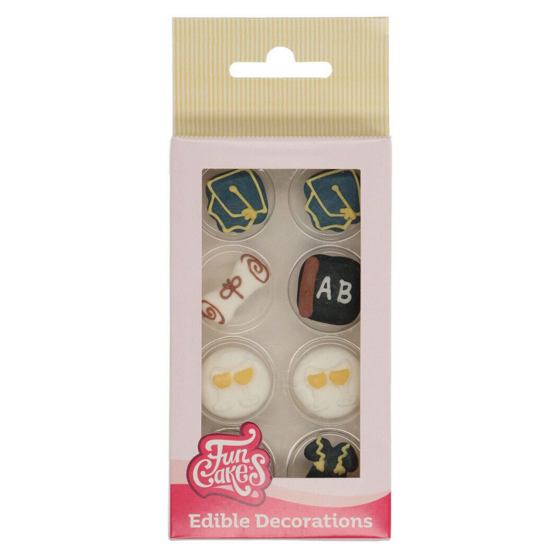 This Graduation set contains 8 figurines: 2 Mortarboards, 2 champagne glasses, a book, a parchment and 2 gowns.