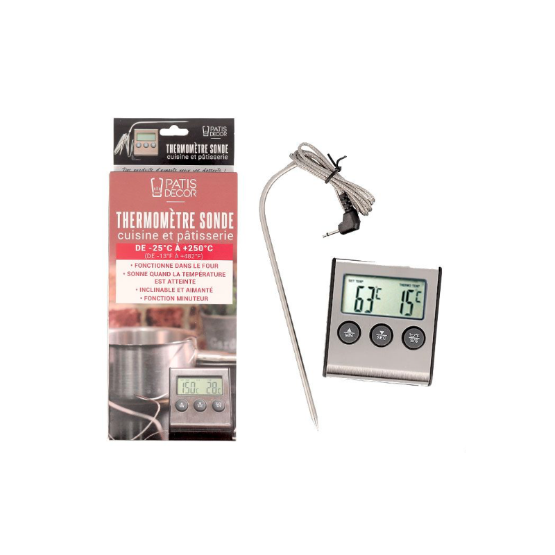 Ce thermomètre à sonde multifonctions de -25°C à +250°C sera parfait pour mesurer la température de vos caramels, sirops de sucre, mais aussi de toute autre préparation salée ou sucrée.