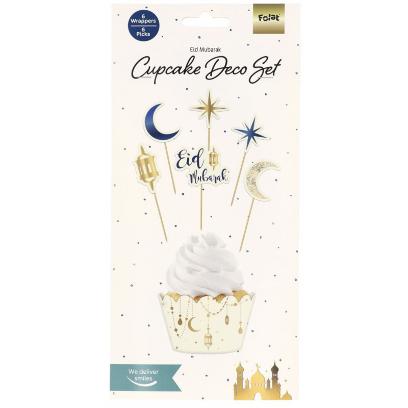 Le set comprend des caissettes à cupcakes et des pics en bois avec des figures décoratives telles que des lunes, des étoiles, une lampe à huile et un message Eid Mubarak. Les décorations sont réalisées en papier avec marquage à chaud sur une face et les pics en bois mesurent env. 8,5 cm.