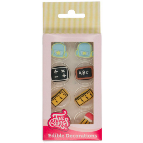Cet ensemble de Retour à l'École contient 8 figurines : 2 sacs à dos, une calculatrice, un tableau noir, 2 règles et 2 crayons.