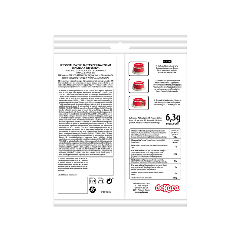 Ces disques comestibles en papier de 20 cm sont parfaits pour décorer vos gâteaux, tartes et desserts. Faciles à utiliser, ils se posent directement sur la surface de vos créations pour un effet visuel élégant. Fabriqués à partir de papier comestible, ils sont entièrement sûrs à consommer et disponibles dans divers motifs pour s'adapter à tout type d'événement. Idéaux pour les anniversaires, mariages et autres célébrations, ces disques ajoutent une touche finale personnalisée et professionnelle à vos desserts.