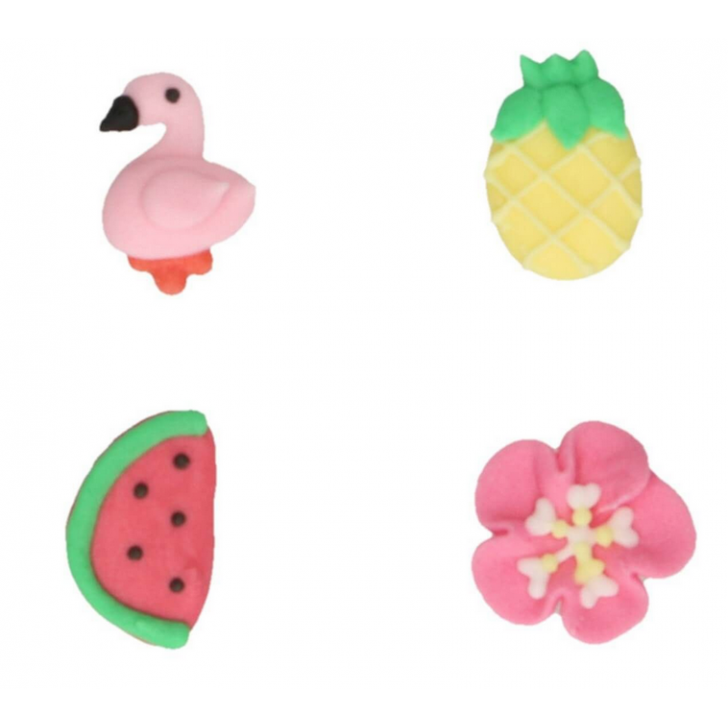 L’ensemble contient 8 décors en sucre comestibles avec des flamants roses, des ananas, des pastèques et des fleurs tropicales.