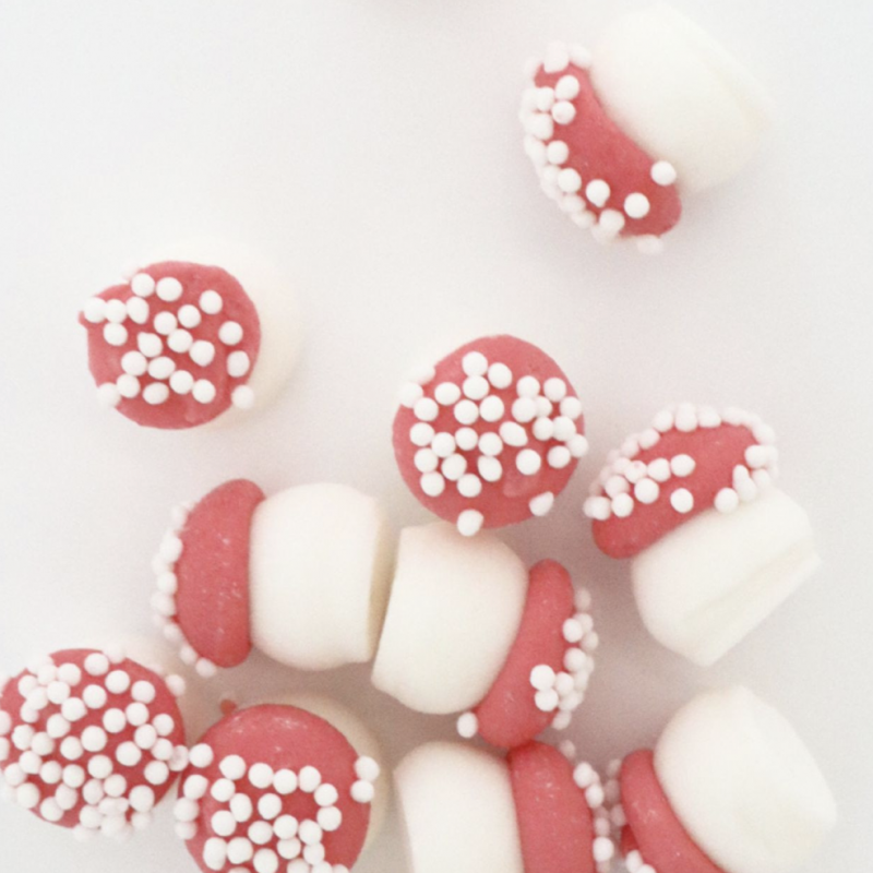 Ingrédients : sucre de canne, sucre de betterave, blanc d’OEUF en poudre, amidon (maïs), eau, stabilisant : E336, extrait de carthame, colorants : E120, E163, arôme naturel : vanille, épaississant : E414, sirop de glucose.