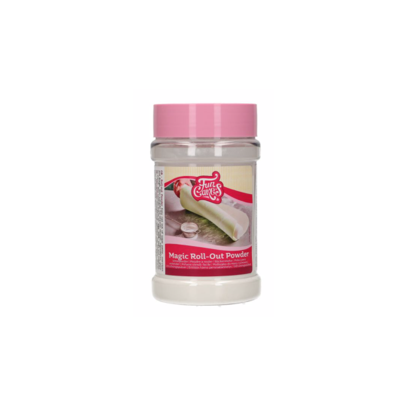 Le FunCakes Magic Roll-Out Powder, aussi appelé Bäckerstärke en Allemagne, est un amidon de pomme de terre particulièrement fin. Cette poudre est particulièrement adaptée pour le déroulement de fondants, massepain et de la pâte. Mais vous pouvez aussi l'utiliser pour "fariner" vos moules en silicone. L'amidon empêchera votre préparation de coller.