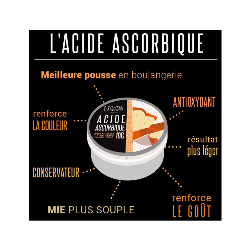 Il apporte du goût et de la couleur, améliore les pâtes levées et agit comme antioxydant et conservateur. Il remplace efficacement le citron dans de nombreuses préparations, prolonge la conservation et aide à préserver la couleur des fruits, légumes ou charcuteries. Il est également apprécié en boulangerie pour favoriser l’action de la levure et assouplir les pâtes.