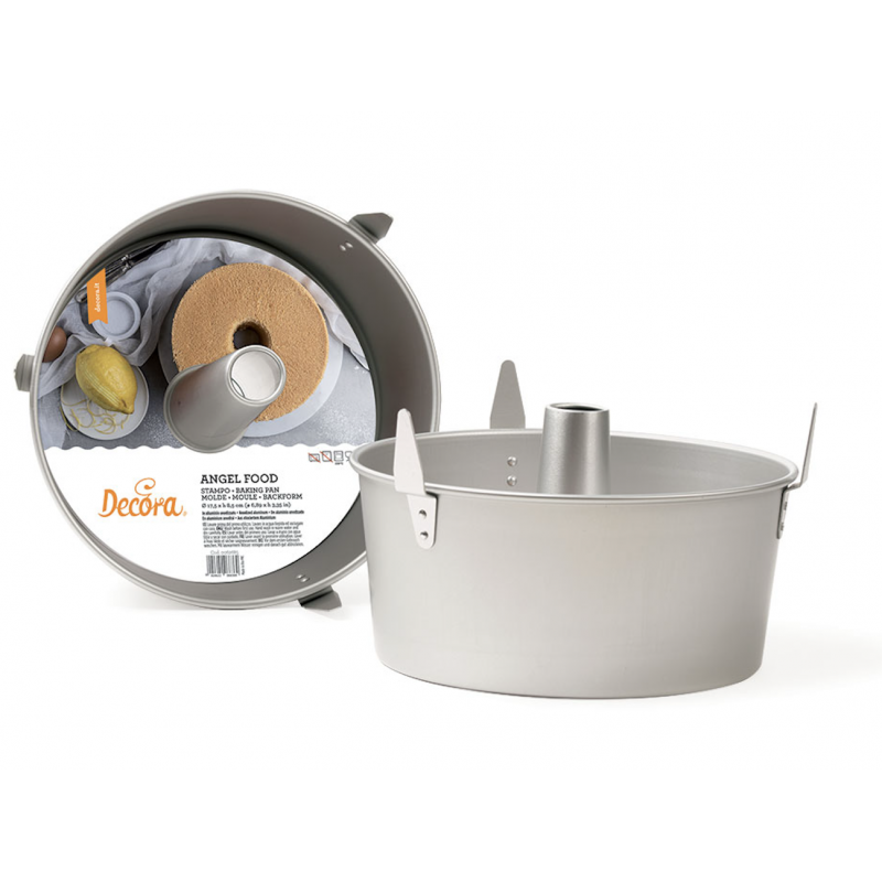 Moule haut et rond avec cheminée centrale, diamètre de 25 cm sur une hauteur de 11 cm, son fond est amovible. Les côtés droits facilitent la montée de la pâte et permettent d'obtenir des bords lisses et agréables. Les trois pieds du moule permettent au gâteau des anges de refroidir à l'envers une fois cuit.