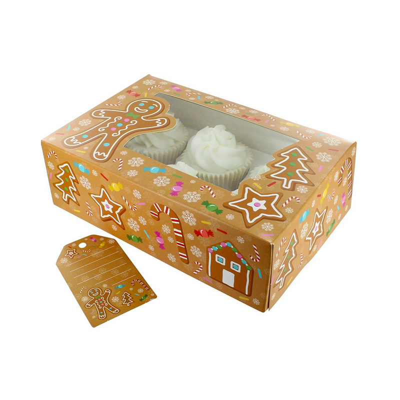 Ces boîtes à cupcakes sur le thème de la maison en pain d'épices sont un excellent moyen de transporter et de présenter vos délicieuses friandises. Les boîtes sont livrées avec une étiquette cadeau et une double insertion pour 6 cupcakes de taille standard ou 12 mini cupcakes.