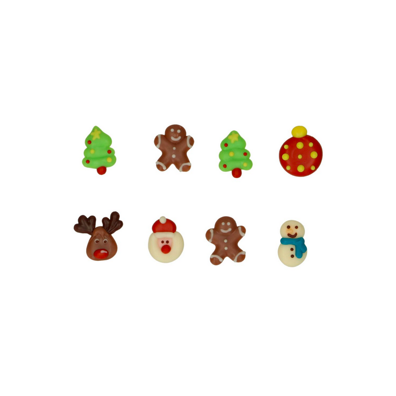 Ce set contient 8 décorations : Arbres de Noël, bonshommes en pain d'épices, renne, Père Noël et bonhomme de neige.
